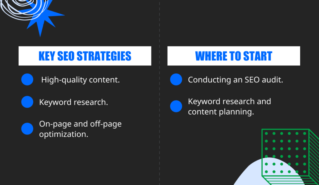 SEO audit. Can’t stress this enough. Please run a full SEO audit of the website and identify the shortcomings. This should give you a good idea of where to start.